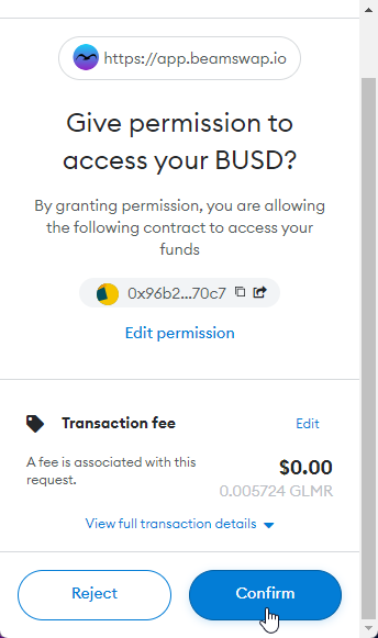 The MetaMask pop-up will appear. Click on **Confirm** to proceed.