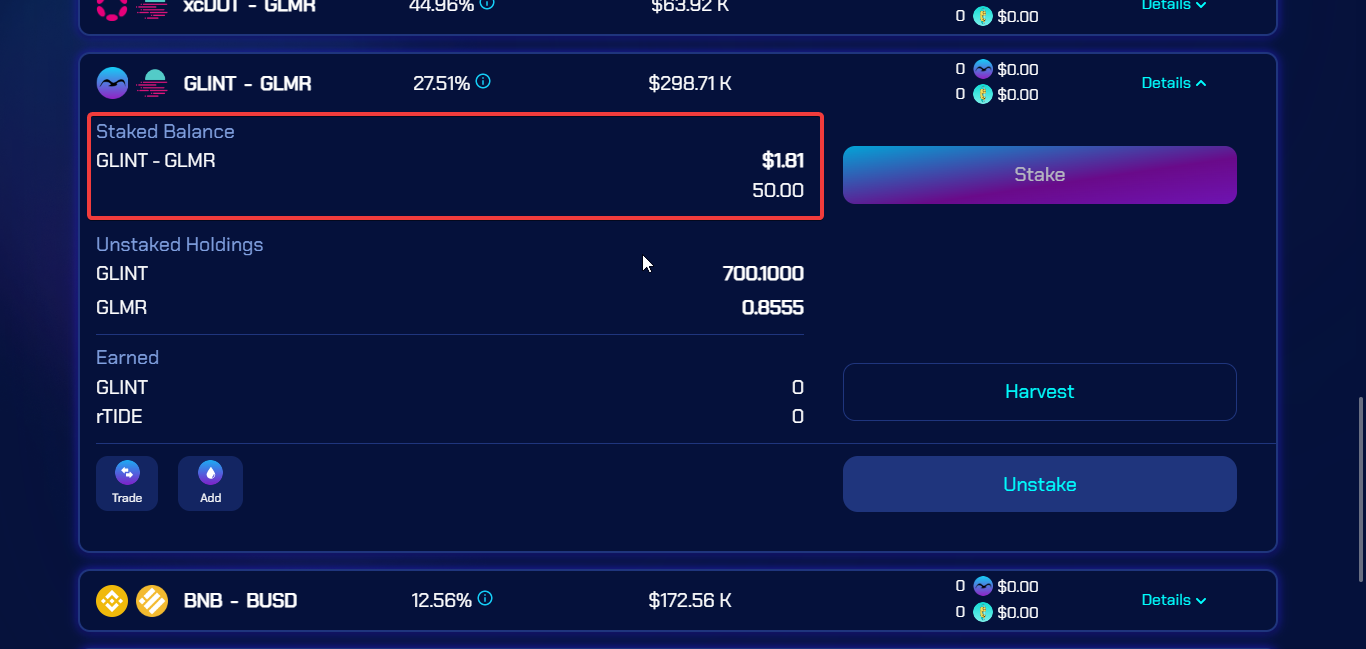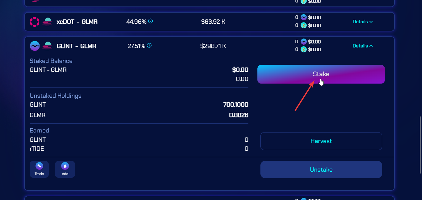 Choose your farm by clicking on **Details** and then click on **Stake**.